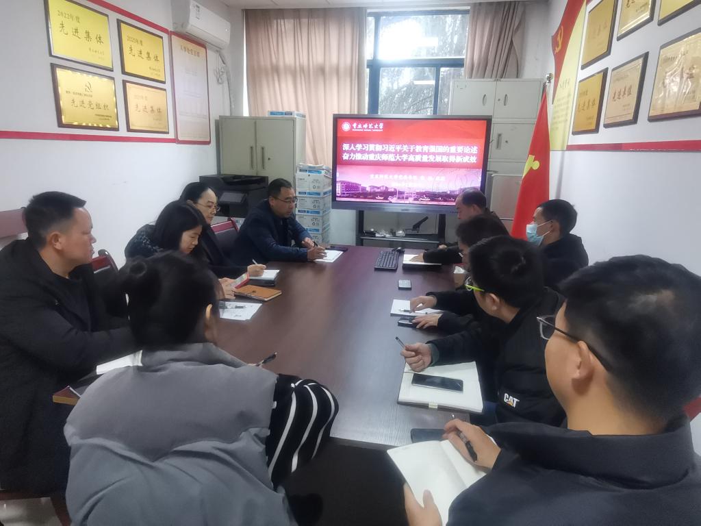 首先,陈进东同志组织大家学习了《中共mansion88主页委员会关于印发打造新时代“红岩先锋”变革型组织工作实施方案的通知》《 中共mansion88主页委员会关于印发落实全面从严治党主体责任清单等7个责任清单的通知》《中共mansion88主页委员会关于印发常态化“三服务”工作方案的通知》文件精神。随后,带领大家学习了在2024年春季干部大会上学校党委书记张艳以《深入学习贯彻习近平总书记关于教育强国的重要论述,奋力推动mansion88主页高质量发展取得新成效》为题讲的党课。要求大家要始终对党绝对忠诚、要坚定理想信念、要树立服务师生的工作理念,积极担当作为,在推动学校事业高质量发展过程中,发挥党员先锋模范作用。