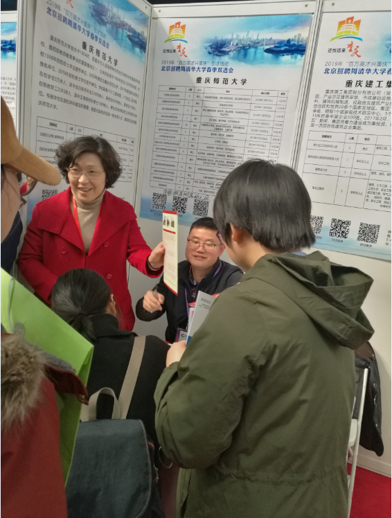 为贯彻落实重庆市科教兴市和人才强市战略计划的要求部署,深入推进实施学校人才强校战略,优化学校人才队伍学缘结构,学校人事处、人才办组织有关人员和用人单位参加了由重庆市人力资源和社会保障局主办、重庆市人才交流服务中心承办、重庆市人才大市场协办的“百万英才兴重庆”引才活动—北京招聘周,于2019年3月21日—23日先后赴中国人民大学、清华大学和北京大学开展高层次人才招聘。